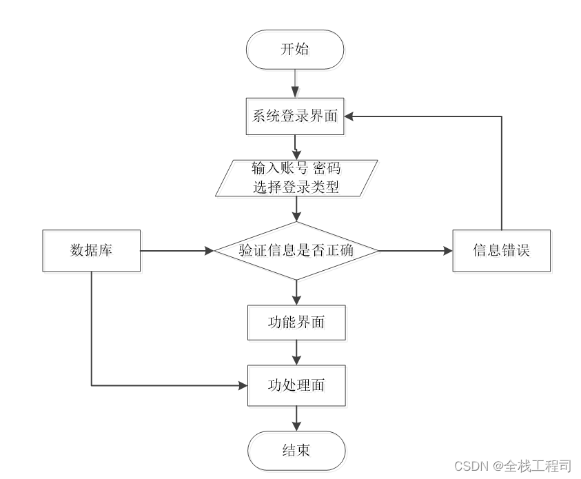 用户想进入系统,首先进入系统登录界面,通过正确的用户名、密码,选择登录类型登录,系统会检查登录信息,信息正确,然后输入相应的功能界面,提示信息错误,登录失败。系统操作流程如图3-4所示。