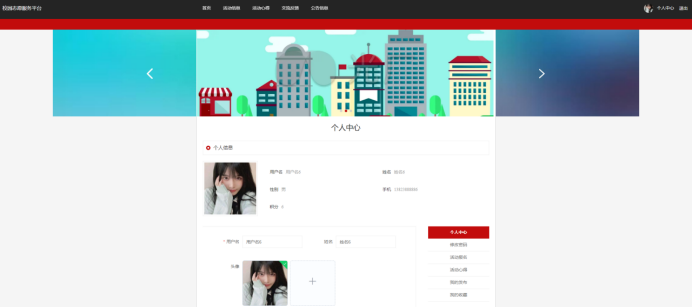 个人中心:在个人中心页面通过填写个人详细信息进行更新操作,还可以对个人中心、修改密码、活动报名、活动心得、我的发布、我的收藏等进行详细操作;如图5-5所示: