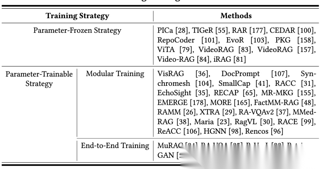 一类是参数可训练策略:包含模块化训练(独立优化各组件,适用场景为需针对性提升特定组件性能的场景,代表研究有VisRAG、RACC,优势是灵活度高、易维护,劣势是组件协同性不足)和端到端训练(联合优化检索器与生成器,适用场景为追求最优系统性能的场景,代表研究有RA-VQA、ReVeaL,优势是性能最优,劣势是计算成本高、部署灵活度差)。