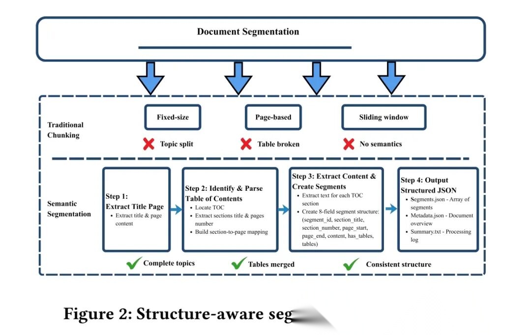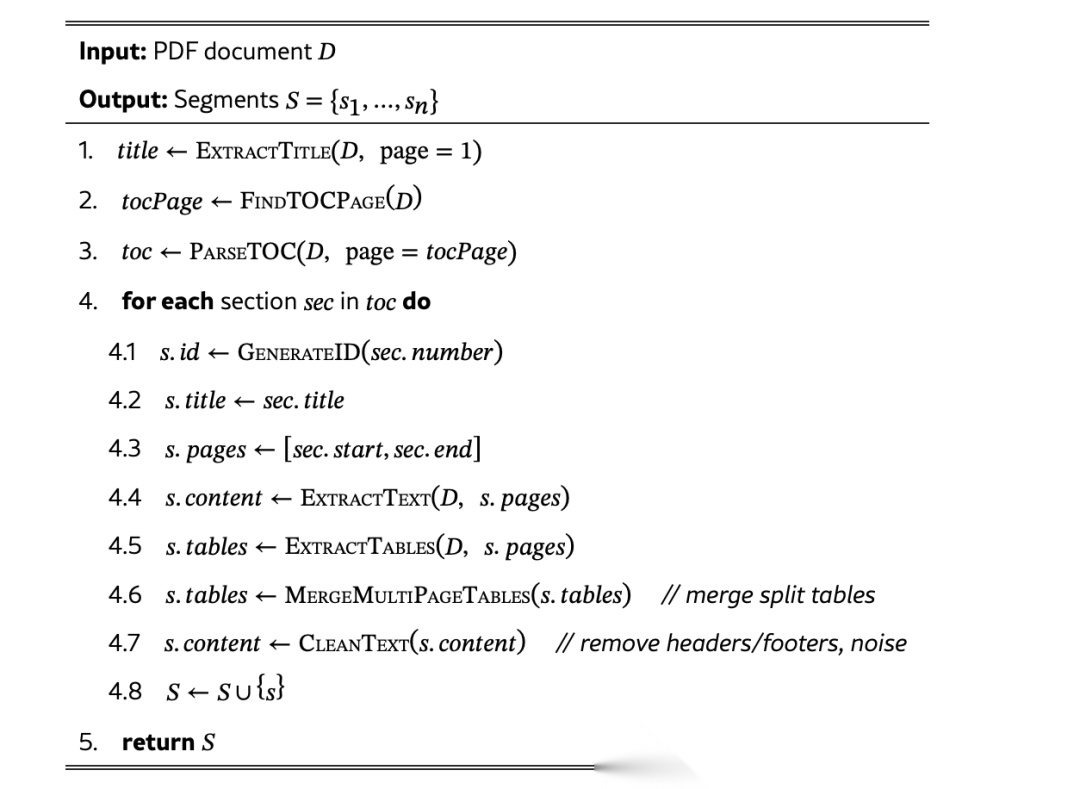 具体实现上,步骤为:step1.识别目录页面与标题,确定自然分割边界;->step2.合并跨页表格,清理布局冗余;->step3.保留片段标题、页面范围、sectionID等元数据;->step4.确保片段为完整概念单元(如指标定义、公式)