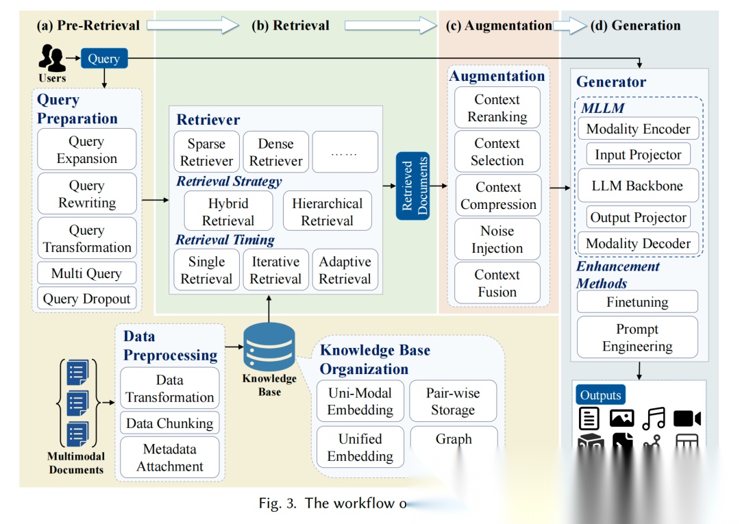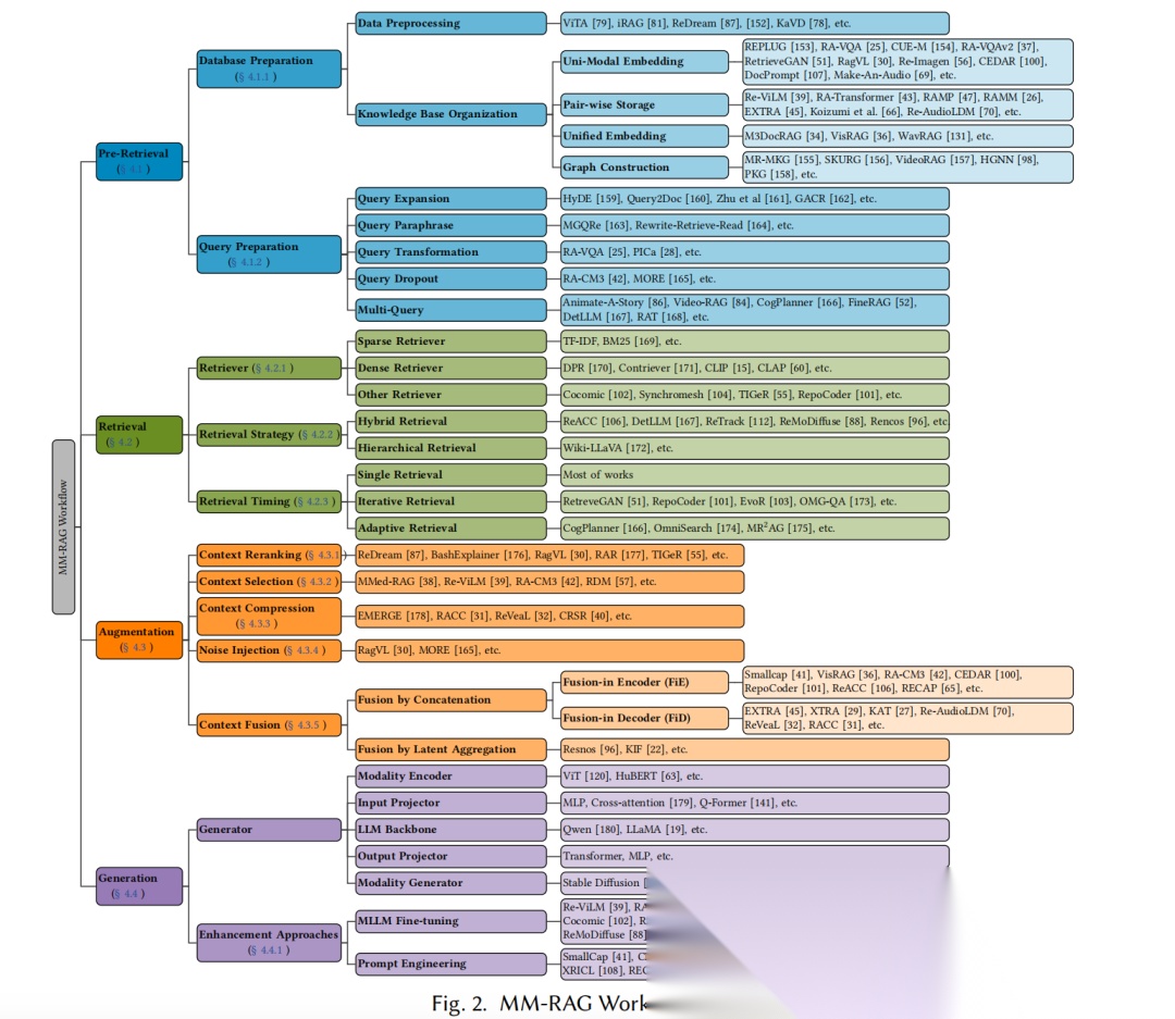 预检索阶段,关键操作是知识库准备(4种组织方式:单模态嵌入、成对存储、统一嵌入、图构建)和查询准备(5种优化技术:扩展、改写、转换、dropout、多查询);