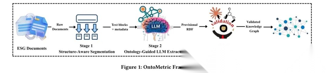 具体的看这个工作《OntoMetric: An Ontology-Guided Framework for Automated ESG Knowledge Graph Construction》(https://arxiv.org/pdf/2512.01289),搞了一套“自动把ESG政策文档变成规整可用的知识图谱”的流程,核心是用“先拆分、再提取、后校验”的思路解决“文档乱、提取不准、没法审计”的问题。