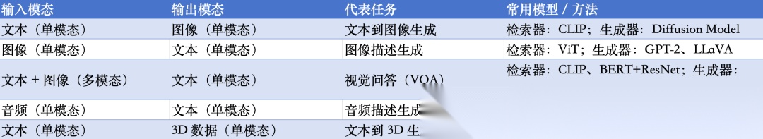 这块,看一个技术总结,如《A Comprehensive Survey on Multimodal RAG: All Combinations of Modalities as Input and Output》,https://doi.org/10.36227/techrxiv.176341513.38473003/v2,https://github.com/INTREBID/Awesome-MM-RAG,所有可能使用的模态组合作为输入和输出,包括文本、图像、音频、视频、代码、表格、知识图谱、3D 对象等。一共54个。