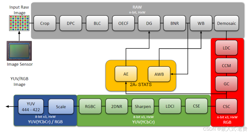 isp就是pipeline顺序处理图,大家可以先把代码下载下来,看一下基本的说明,了解一个大概。剩下来的内容,慢慢学习即可。中间的AE和AWB反馈是两点,大家可以记一下。