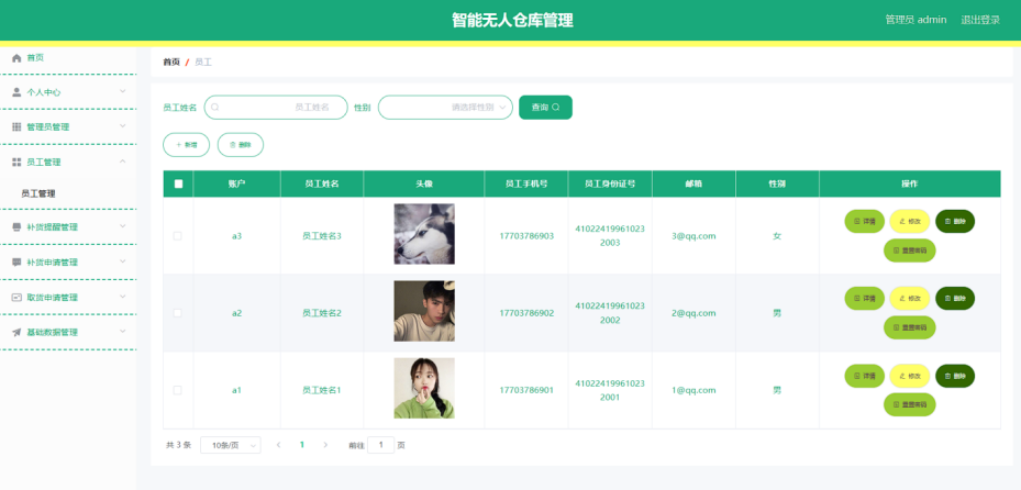 System features include employee and administrator interfaces. Staff functions include receiving replenishment reminders, submitting replenishment and pick-up applications, etc., while administrators can perform tasks such as staff management, application approval and basic data maintenance. Through these functions, the system realizes efficient inventory management, automated replenishment reminders and accurate item tracking.