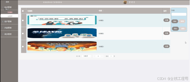 (2)站点管理:当点击“站点管理”这一菜单的时候,会出现轮播图+公告栏两个子菜单,可以对这两个模块进行增删改查操作;