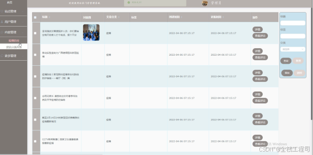 (4)内容管理:当点击“内容管理”这一菜单的时候,会出现疫情防控+资讯分类列表这两个子菜单,能够对用户在前台提交的疫情防控进行管理,同时对前台展示的资讯信息进行增删改查操作;