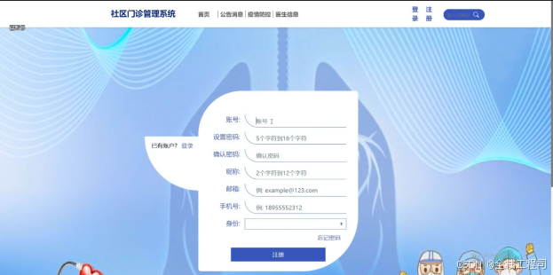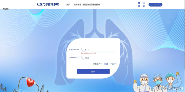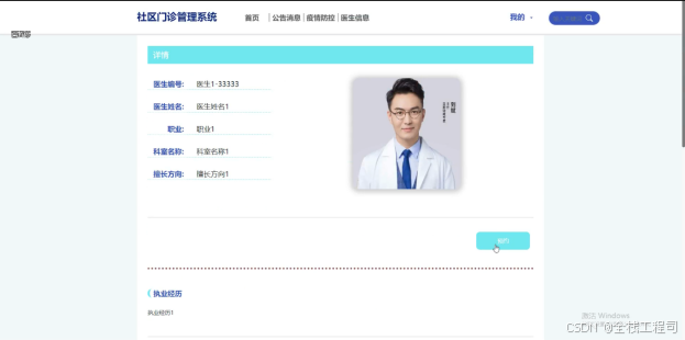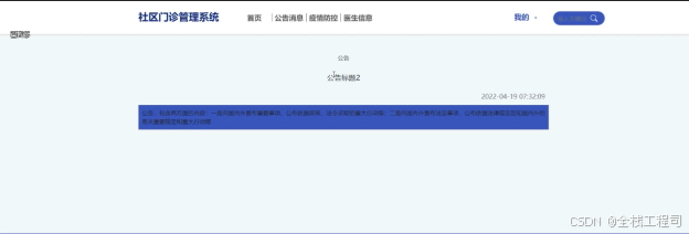 (2)查看社区门诊管理系统的首页信息:社区门诊管理系统的首页信息包含了首页、公告消息、疫情防控、医生信息等。