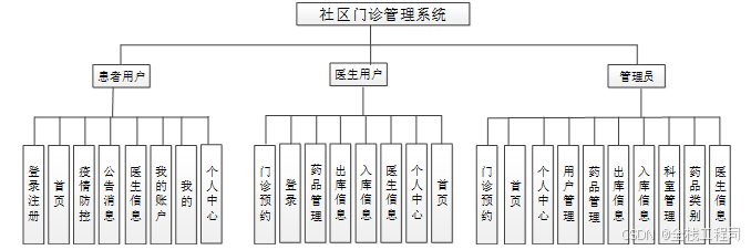 按照社区门诊管理系统的角色,我划分为了患者用户管理模块、医生用户管理模块和管理员管理模块这三大部分。