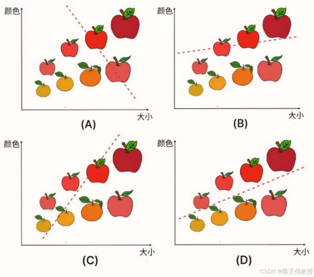 (A)-(D)所示,L 逐渐降低,苹果-桔子的分类边界也越来越准确。
