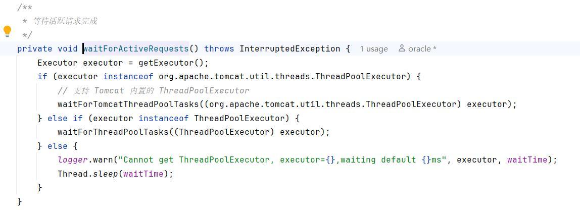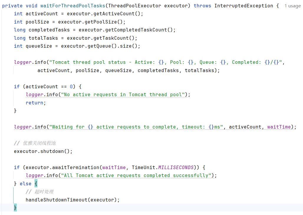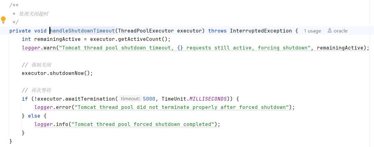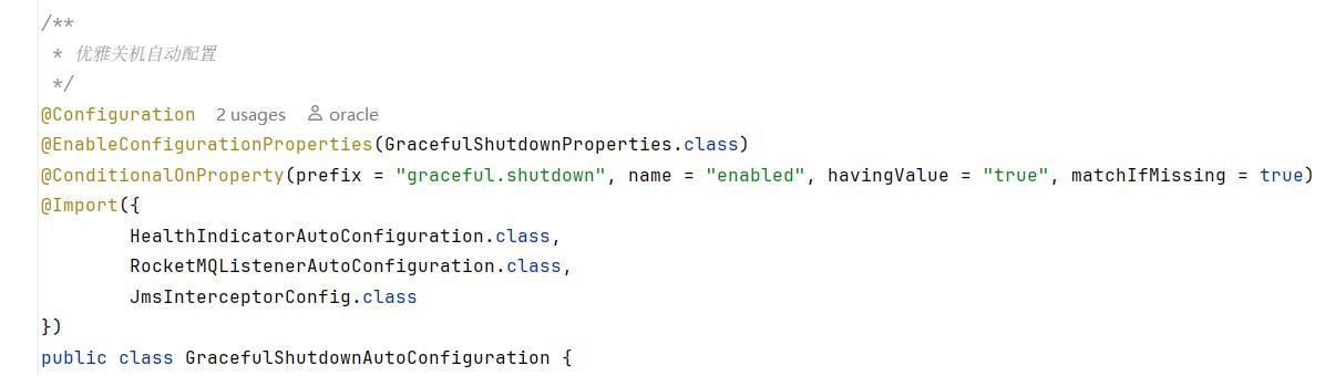 @ConditionalOnProperty:这个注解的作用是根据某个配置文件判断,类或者方法支付要执行,通常和@Configuration或者@Bean组合使用。在我们上面的截图中,实际就是通过判断优雅关机开关是否开启进行条件配置,如果条件缺失,我们给了默认值true。@ConditionalOnMissingBean:当缺少某个类的bean时配置,类似单例模式@ConditionalOnClass:当有指定的class的时候触发配置。这个就是我前面说的要和pom那两个标签组合的条件配置。所有的关机组件逻辑都要加上这个判断,确保核心类存在(也就是依赖存在)时,才配置对应组件的关机逻辑。@ConditionalOnWebApplication:这个注解是加在Tomcat的关机组件上的,确保它是WebApplication