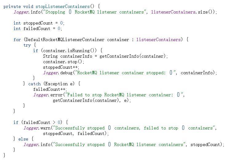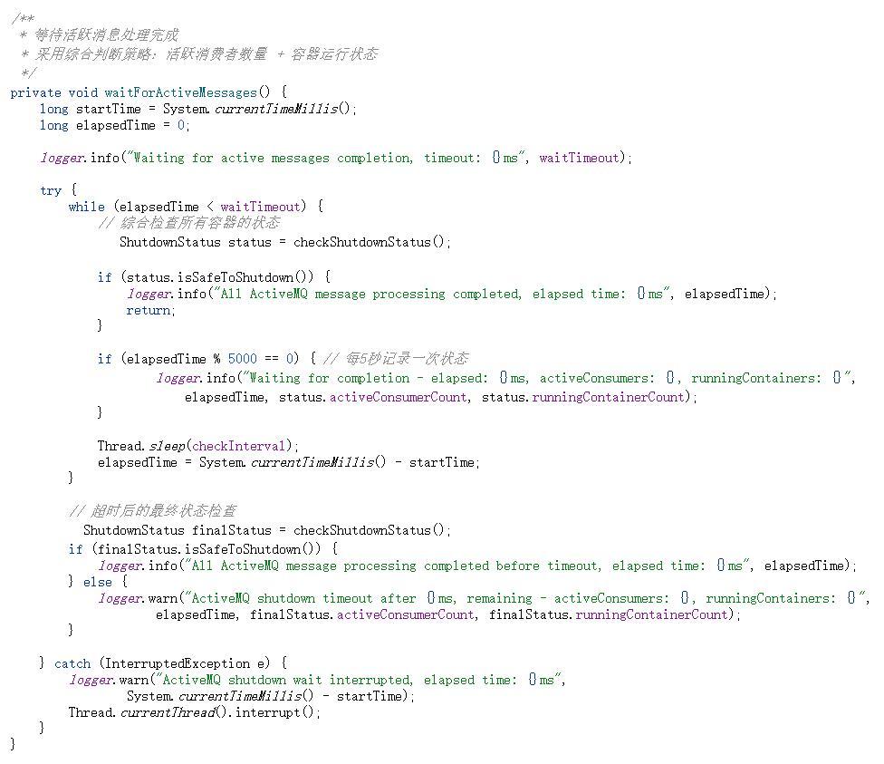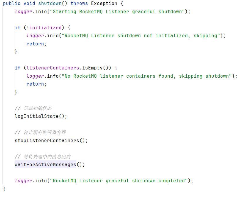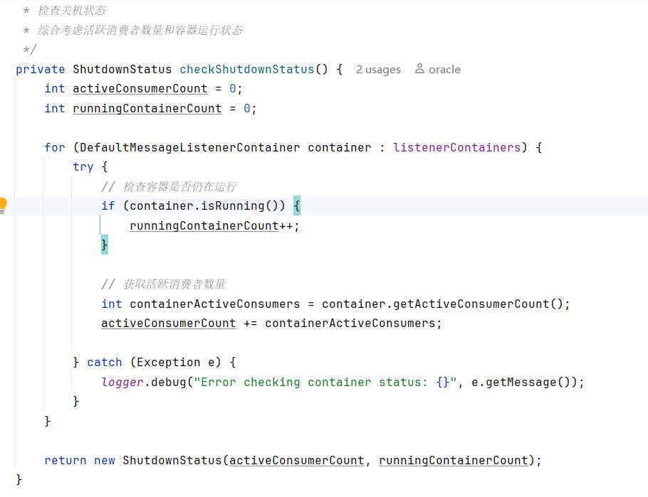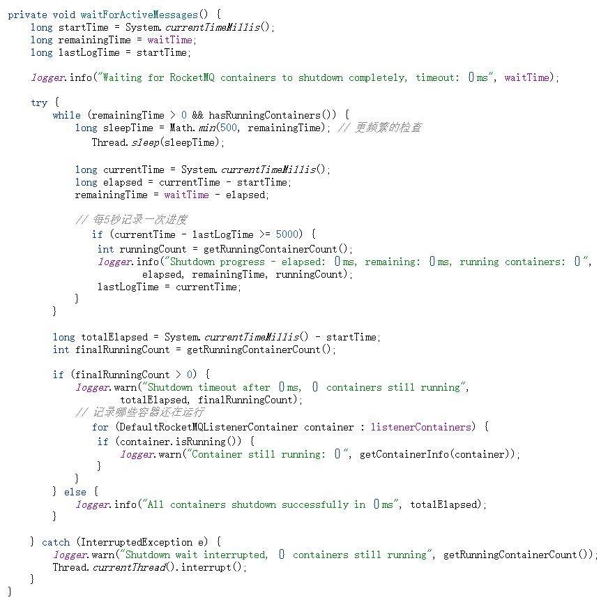 - 等待处理中的容器停止:这里直接用的是容器状态判断的,因为消费中的消息数量,需要调用