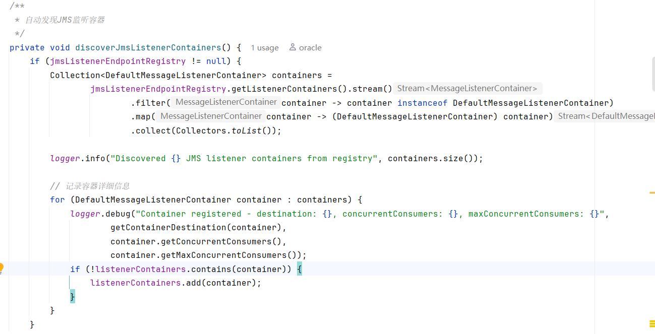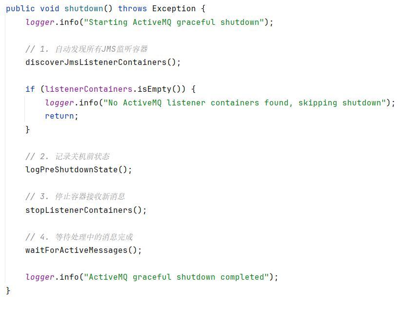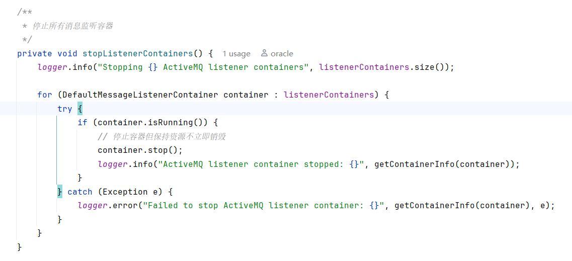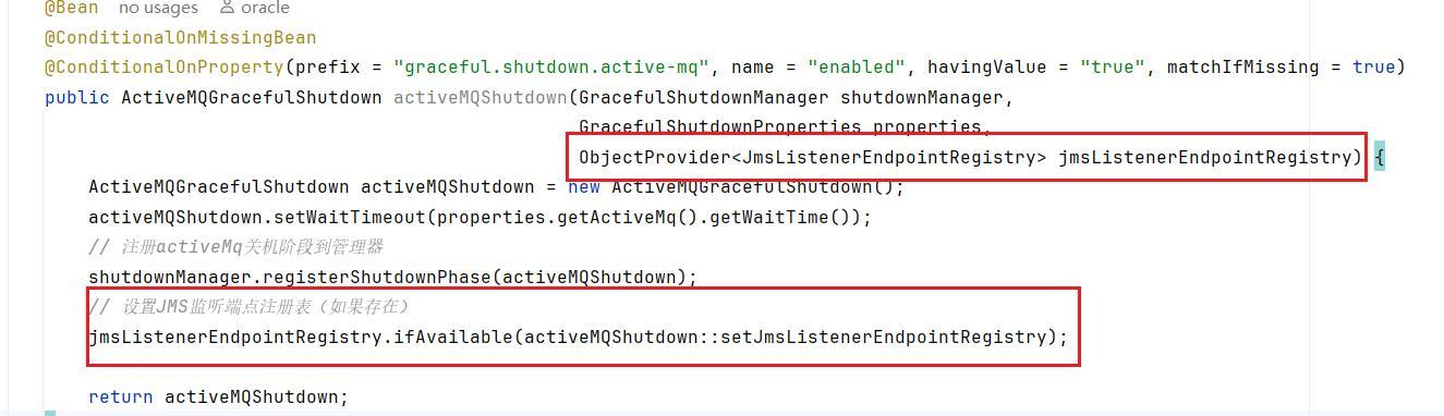 activeMQ的服务发现逻辑也比较简单,核心其实就是将JmsListenerEndpointRegistry注入我们的关机组件,关机组件要通过这个对象获取所有的DefaultMessageListenerContainer消费者容器: