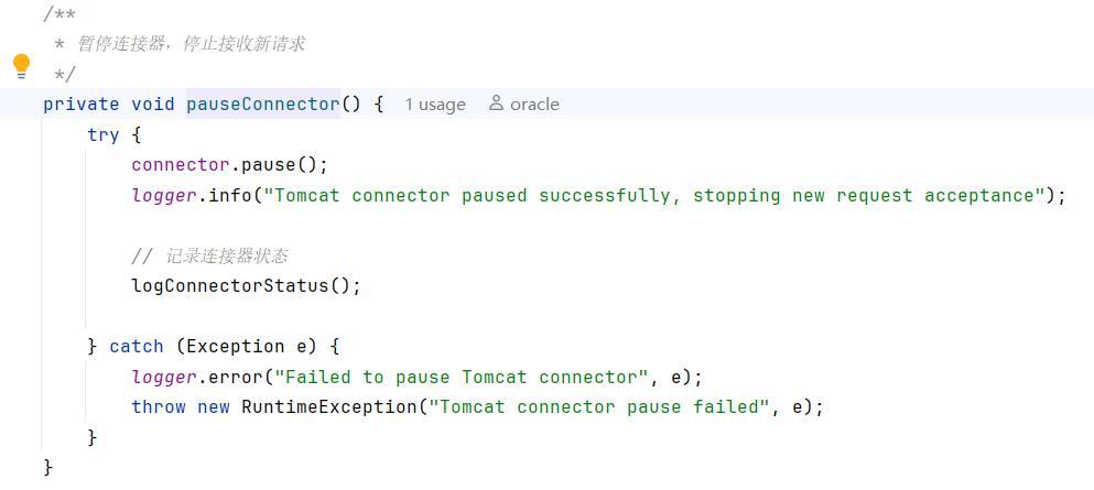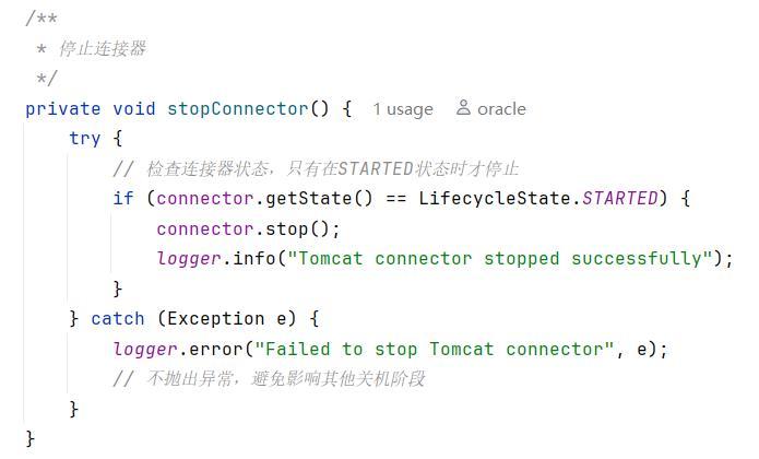 停止连接器也很简单,就是调用stop方法,不过关闭前需要判断下,避免重复关闭(springboot本身的关机逻辑也会触发关闭):