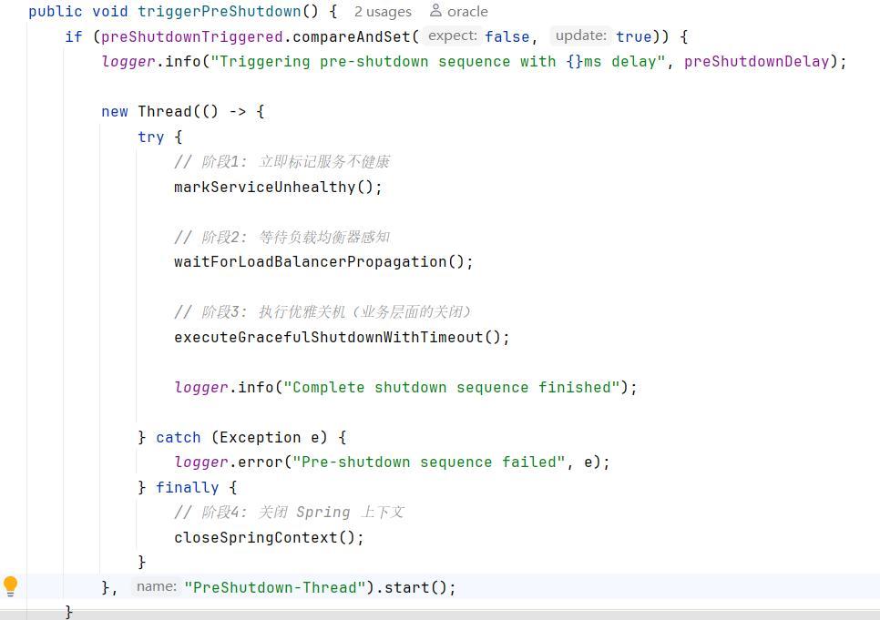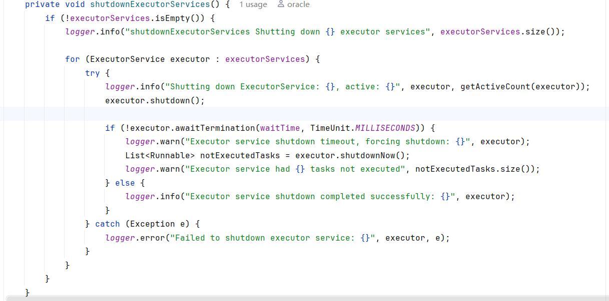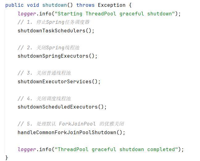 比如说 “重复关闭”的问题:虽然代码里加了判断,不会因为重复调用而报错,但 Spring Boot 底层的关机钩子 (ShutdownHook) 逻辑其实还在,这里未来还有更优雅的解法。