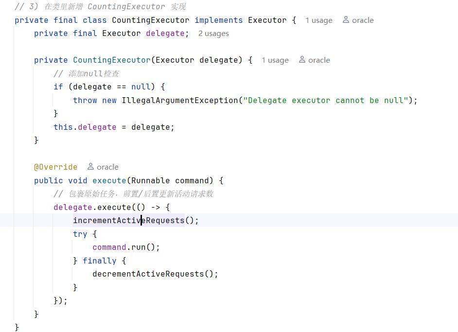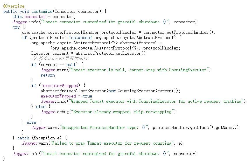 tomcat优雅关机要实现TomcatConnectorCustomizer接口,并实现customize方法,主要是为了关机时能获取到连接器,同时设置Executor实现统计活跃请求数的逻辑: