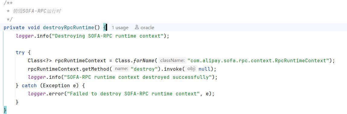 客户端也叫运行时环境,这个销毁就比较简单了,没有监控,直接通过反射调用RpcRuntimeContext的destroy方法即可。