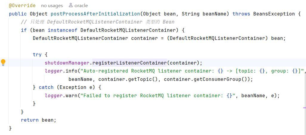 组件的发现逻辑是通过spring的后置处理器来完成的,将所有的DefaultRocketMQListenerContainer收集起来。