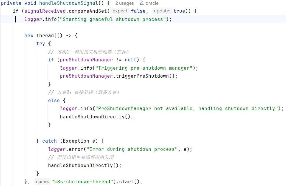 核心实现其实就是创建一个bean,并在bean初始化逻辑中定义一个处理TERM信号的Signal,并在Signal的handle逻辑中加入我们的预关机逻辑即可: