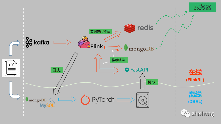 整体架构见下图, 完整代码和流程见 FlinkRL (https://github.com/massquantity/flink-reinforcement-learning) 和 DBRL (https://github.com/massquantity/DBRL) 。