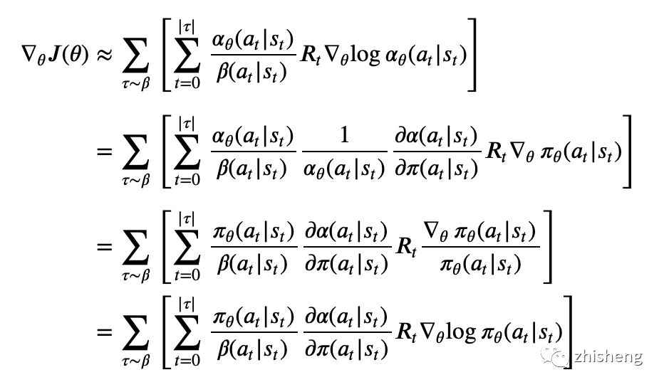 原始的 REINFORCE 算法是 on-policy 的,亦即线上交互和实际优化的是同一个策略,然而论文中说他们线上交互的是不同的策略,甚至是多种不同策略的混合体。这样就导致了数据分布不一致,如果直接使用 REINFORCE 会产生巨大的 bias 。论文中通过重要性采样把算法改造成 off-policy 的: