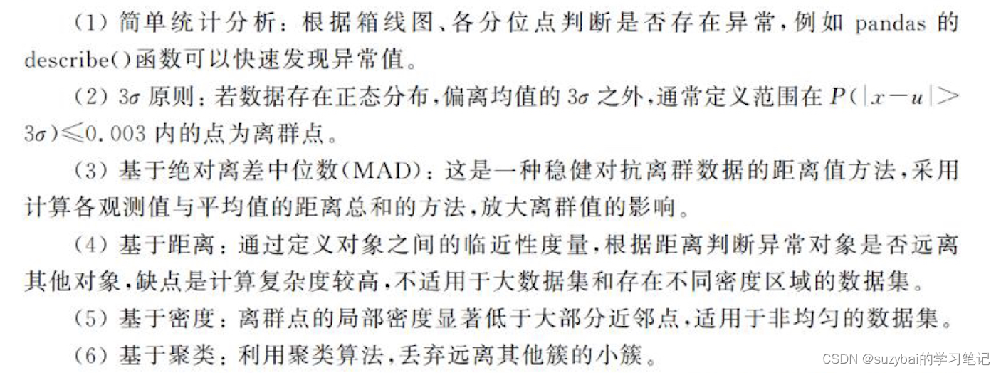 存在异常值是数据分布的常态,处于特定分布区城或范围之外的数据通常被定义为异常或噪声。异常分为两种:①“伪异常”是由于特定的业务运营动作产生的,是正常反应业务的状态,而不是数据本身的异常:②“真异常”不是由于特定的业务运营动作产生的,而是数据本身分布异常,即离群点。主要有以下检测离群点的方法。
