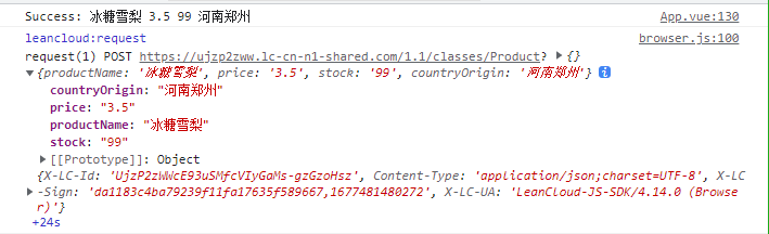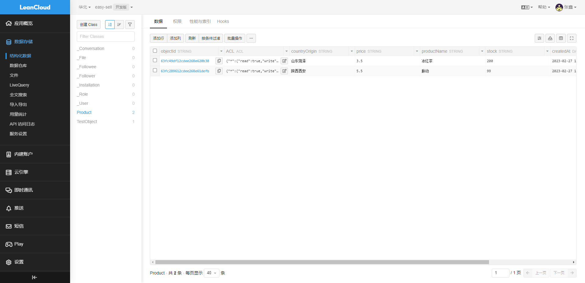 实现数据的新增需要简单的四步操作,声明class、构建对象、为属性赋值、执行save函数,在一切顺利的情况下你在控制台就能看到新增了一个名为Product的Class,并且新增了一条数据,通过控制台也能够清晰看到发送到LeanCloud的数据。