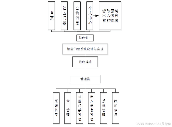 系统设计阶段中,系统结构的设计是必不可少的,结构设计主要是将程序先划分出大的模块,然后再将大的模块一点一点的进行补充,由大模块下再分支出很多的小模块,然后由这些模块共同来构成一个完整的、具体的系统结构。下面是针对智能门禁系统设计与实现而构建的结构图。