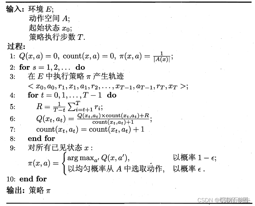 2:策略迭代算法估计的是 状态值函数(state value function) V,而最终的策略是通过 状态动作值函数(state-action value function) Q 来获得。累积奖赏采样值. 多次采样得到多条轨迹后,将每个状态-动作对的累积奖赏采样值进行平均。解决方案:一种直接的策略评估代替方法就是“采样”,然后求平均累积奖赏,作为期望累积奖赏的近似,模型未知的情况下,我们从起始