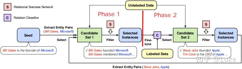 Phase 1 的目标是通过将种子集 Sr 中已有的实体对对齐无标注语料库 来扩展Sr。具体实现上,首先提取出种子集上所有的头尾实体对 ,然后在上匹配出所有包含的上下文 ,进而将 作为实例聚合成图中的 Candidate Set 。直观上看,如果不同实例间共享了同一个实体对,它们就有可能表达同一个关系 。但为了进一步减少假正例,对于每个实例 ,找到种子集中所有同 共享 的实例 ,接着用 RSN 计算 同所有 之间的相似度后取平均得到 。最后,基于做倒排+阈值过滤,将保留的高置信实例加入。