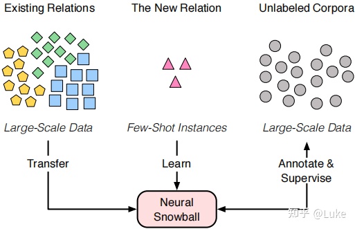 - 前两者仅仅使用了种子关系事实,而 Neural Snowball 则将大规模标注数据集也同时利用了起来。Nerual Snowball 的作者认为,尽管已有关系同新关系的分布可能存在明显差异,但深度学习模型依旧可以提取出高层级的抽像特征来表征未知关系。