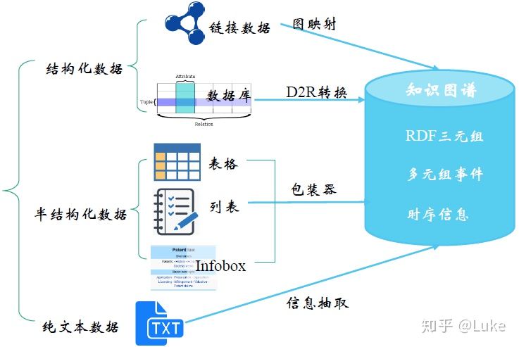 知识抽取(Knowledge Extraction)的目标是从结构化(关系数据库,XML)数据和非结构化(文本,文档,图像)数据中抽取知识。 尽管知识抽取在方法上类似于信息抽取(NLP)和ETL(数据仓库),但它的抽取结果不仅限于结构化信息的生成或关系数据库 schema 的转换。 知识抽取还需要复用已有的知识表示(本体等)或基于源数据生成 schema [1]。