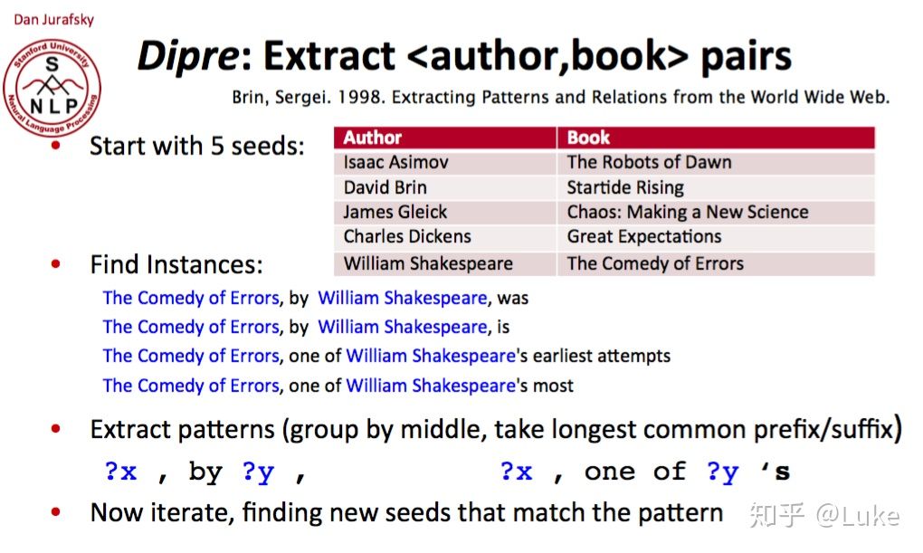 从 5 个种子 tuples 开始,找到包含种子的实例,替换关键词,形成 pattern,迭代匹配,就为 (author, book) 抽取到了 relation pattern, x, by y, 和 x, one of y’s[2]。
