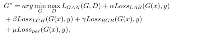 3、损失函数:为了利用LAB和LCH颜色空间更宽的色域表示范围以及更准确地描述颜色饱和度和亮度,我们设计了结合RGB、LAB和LCH颜色空间的多颜色空间损失函数来训练我们的网络。 其中α、β、γ、μ为超参数,经过大量实验分别设置为0.001、1、0.1、100。后面的四个分别是生成器的损失函数它们是定义好的。