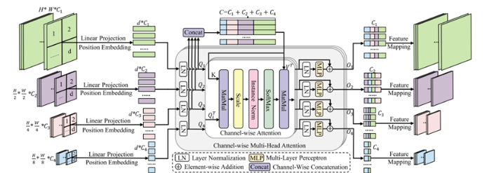 (2)、通道方式多头注意力(CMHA):CMHA 块有 6 个输入,其中 IN 表示实例规范化操作。这种注意力操作沿着通道轴而不是经典的补丁轴进行,可以引导网络关注图像质量下降更严重的通道。此外,在相似度图上使用IN来帮助梯度流顺利传播。