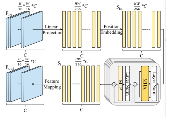 1、SGFMT:用于替代生成器原来的瓶颈层,可以辅助网络对全局信息进行建模,并加强网络对严重退化部分的关注。具体流程大概为:输入特征图通过线性投影转化为一维序列然后嵌入位置编码进入Transformer层(每一个Transformer层包含一个多头注意力块(MHA)和一个前馈神经网络(FFN)),得到输出序列后通过特征映射转化为输出特征图。