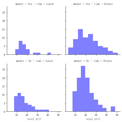 tips = sns.load_dataset("tips") # 导入数据 g = sns.FacetGrid(tips, col="time", row="smoker")# 创建一个绘图表格区域,列按time分类、行按smoker分类 g.map(plt.hist, "total_bill",alpha = 0.5,color = 'b',bins = 10) # 以total_bill字段数据分别做直方图统计