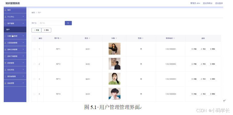 知识管理系统的管理员可以对用户新增,修改,删除,查询操作。具体界面的展示如图5.1所示。