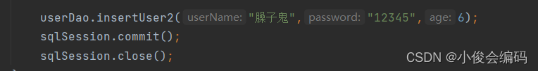 <insert id="insertUser2"> insert into user1(userName,password,age) values(#{userName},#{password},#{age}) </insert>