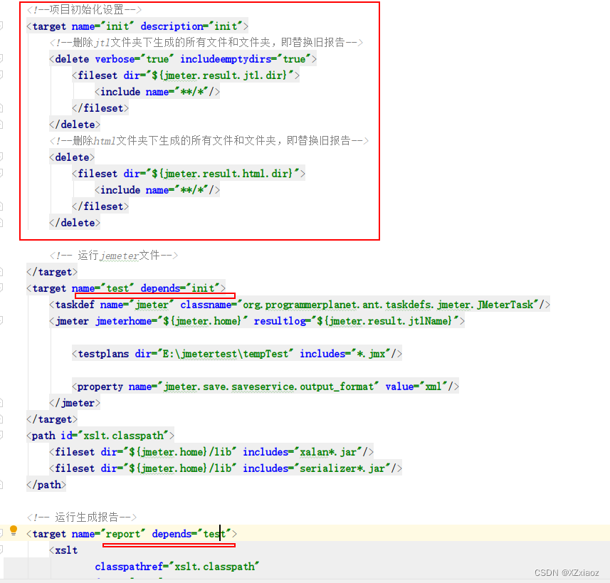 修改build.xml文件,增加项目初始化设置,修改初始化,之后在生成报告前,会先将jtl、html两个文件夹下的内容删除,从而每次生成的报告文件中只有最新一次构建,而不是累加叠加