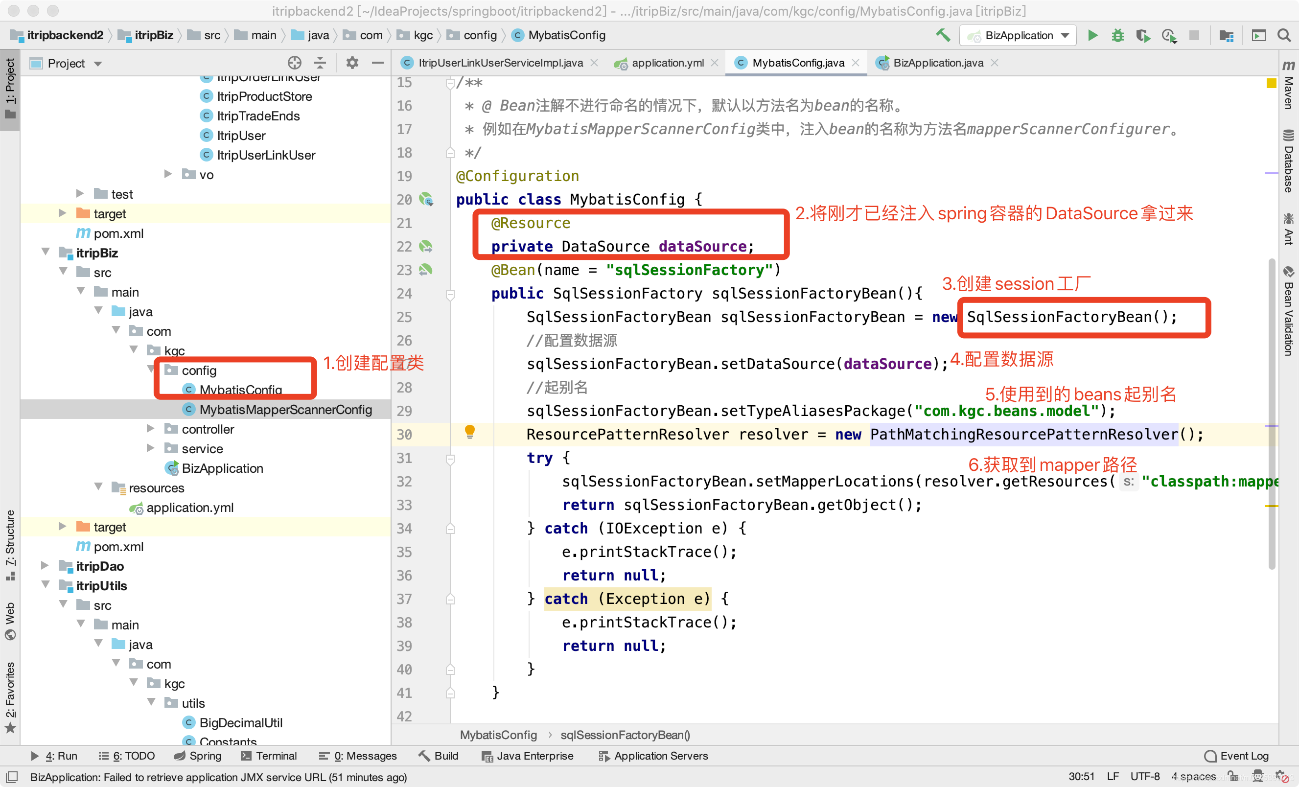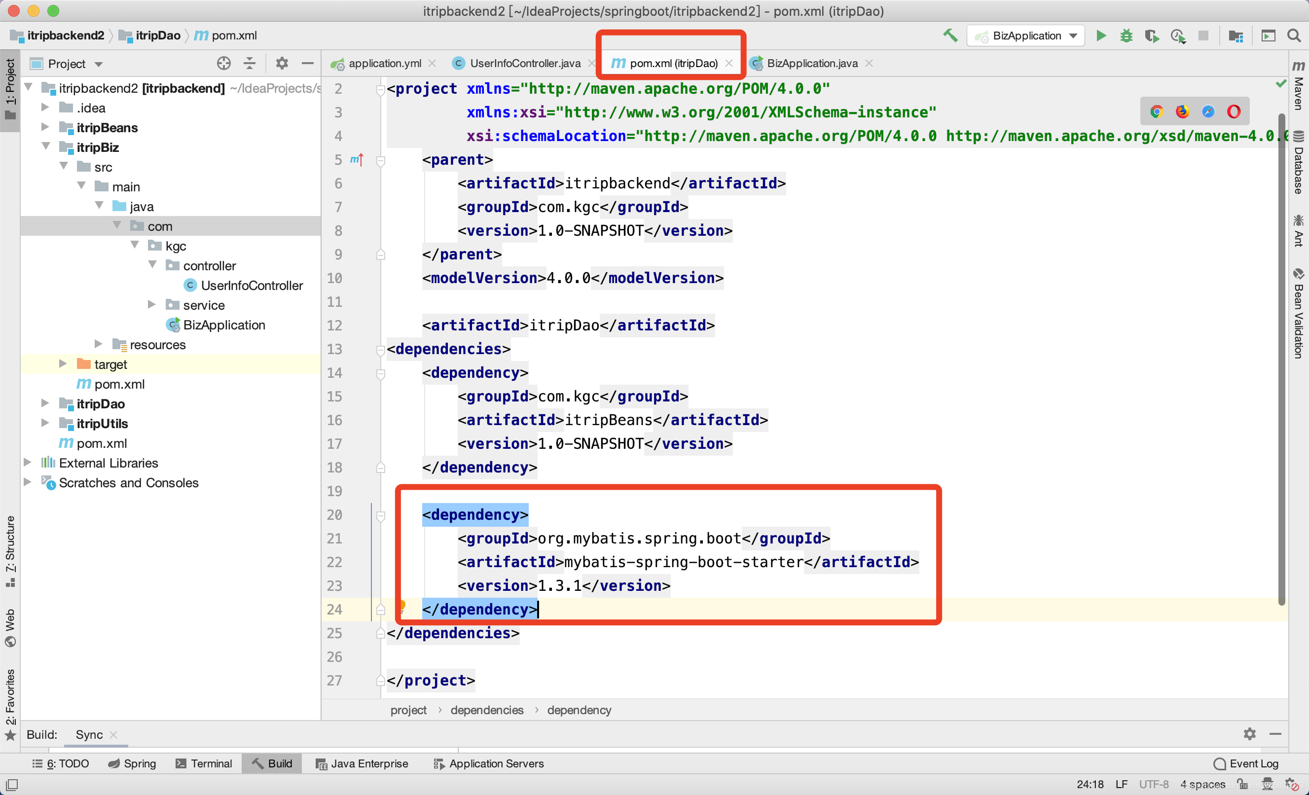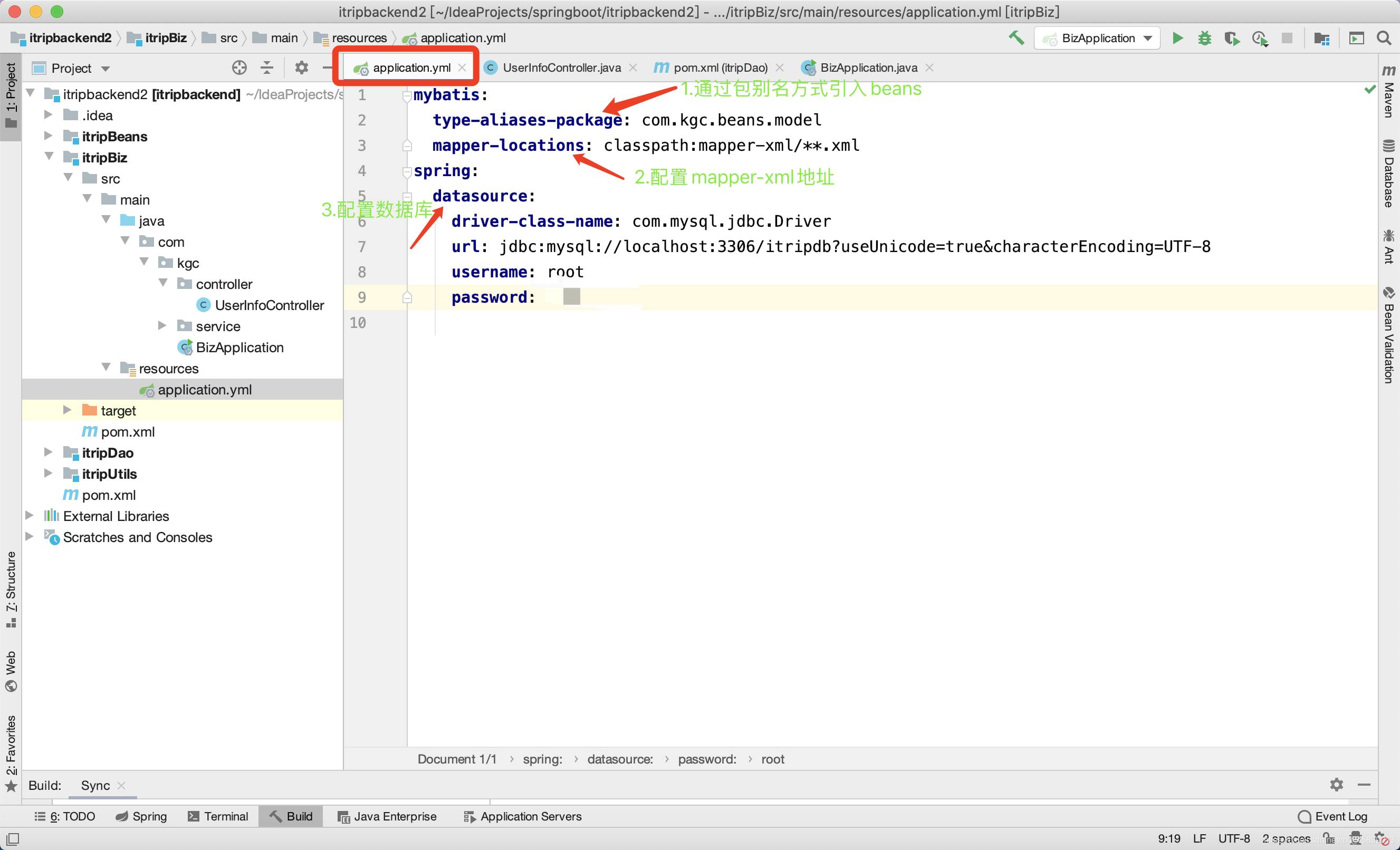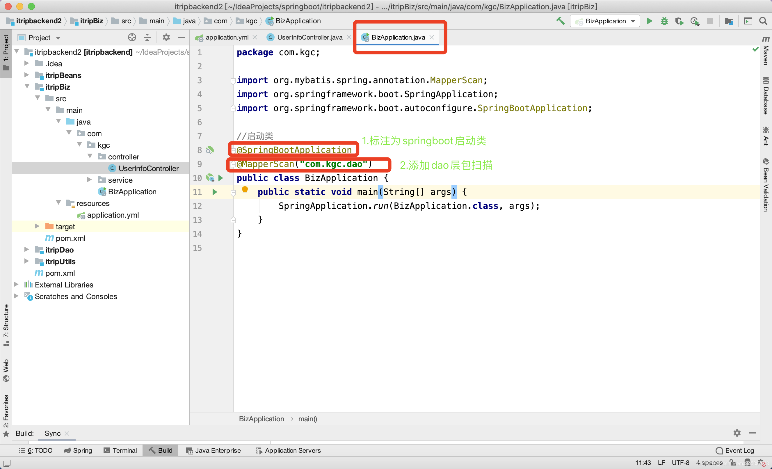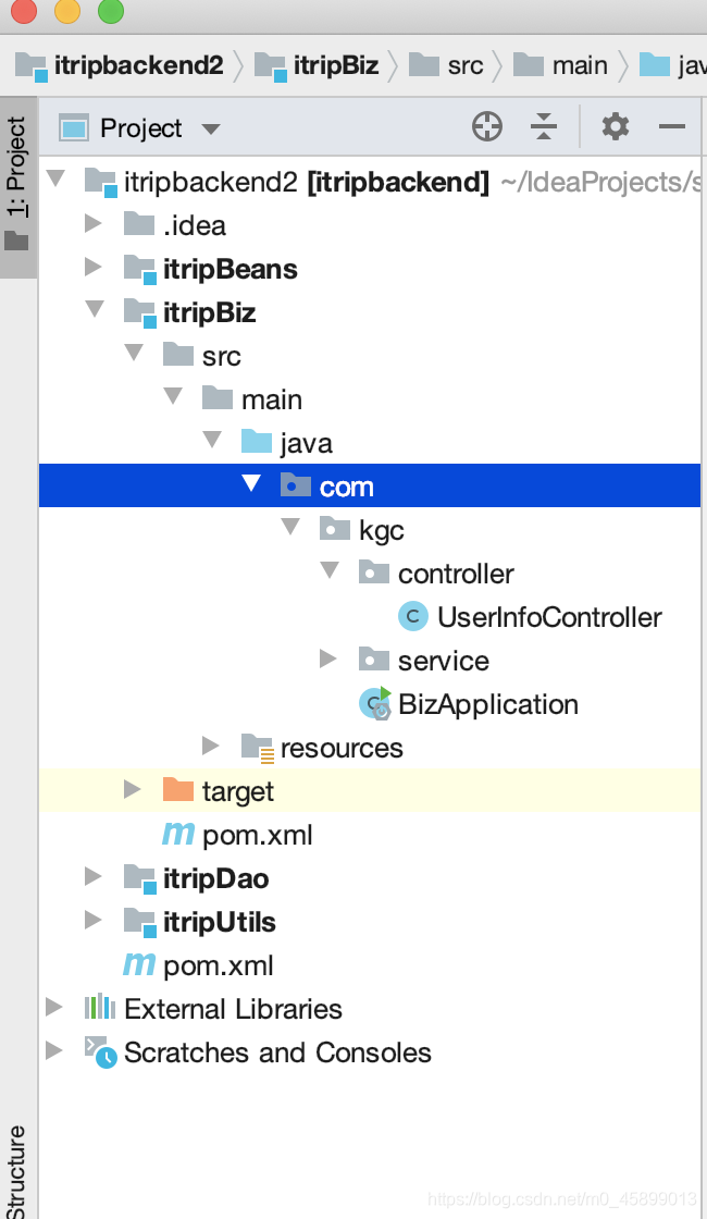 springboot整合mybatis有2种方式:方式一:mybatis-spring-boot-starter方式二:mybatis-spring方式一: mybatis-spring-boot-starter整合MyBatis以爱旅行项目为基准,做biz模块userInfoController接口的整合,业务目前只测试删除联系人接口。其他模块auth、search、trade移除。1.项目结构