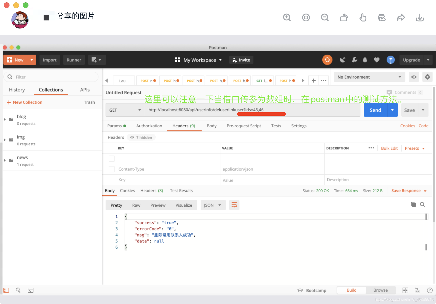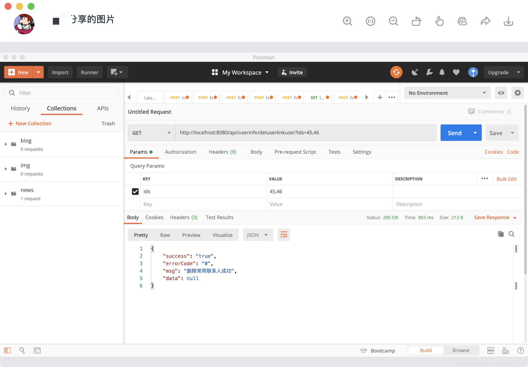 6.检查其他类没有报错后,通过启动类启动springboot成功后,通过postman测试删除联系人方法,成功,并检查数据库是否同步删除,成功。