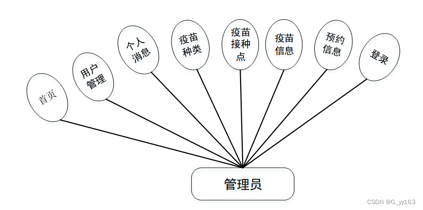 基于社区疫苗管理的设计基于现有的手机,可以实现管理员,首页、疫苗种类、疫苗接种点、疫苗信息、预约信息等详细的了解及统计分析。根据系统功能需求建立的模块关系图如下图: