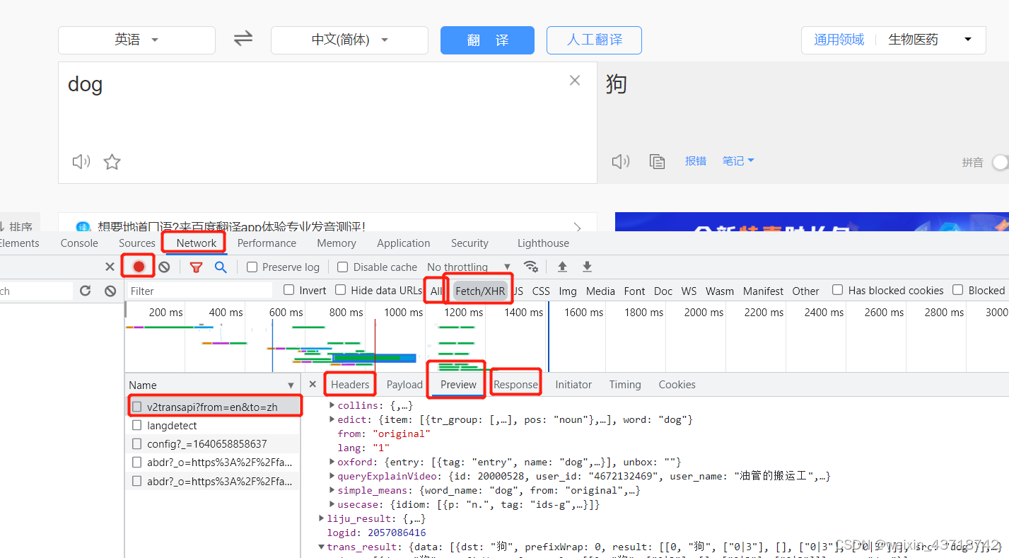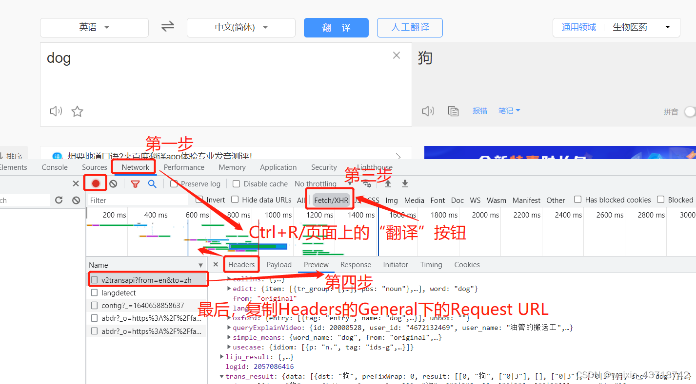找到Network模块,点击网页进行刷新/点击“翻译”按钮/快捷键【Ctrl+R】,