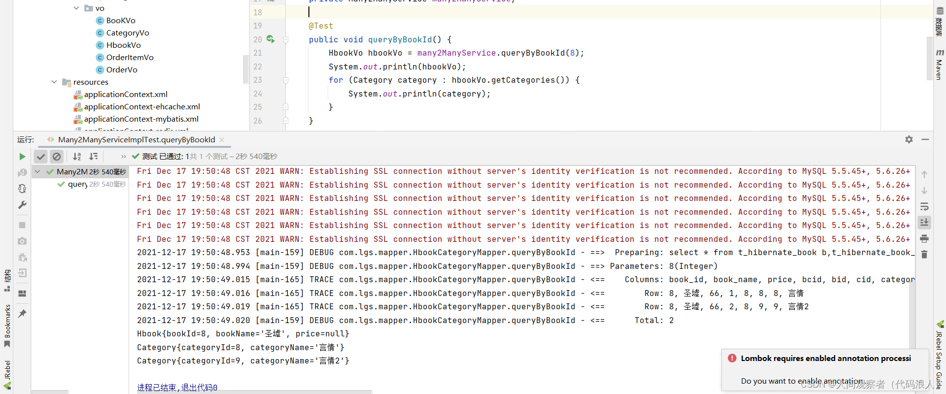 HbookVo hbookVo = many2ManyService.queryByBookId(8);