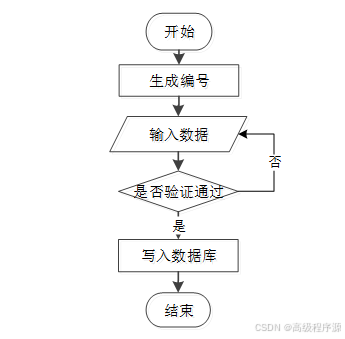 用户成功登入系统后就能够实现增加数据的操作,增加数据的编号由系统生成,用户不能随意填写,除了编号以外,其他增加信息用户自己填写,填写后的信息经过系统验证,验证通过后即可完成数据新增,数据新增的流程图如下图2-4所示。