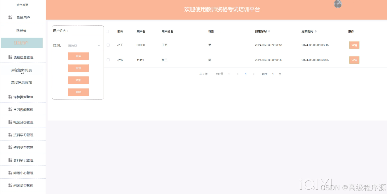 - 系统用户管理:教师资格考试培训平台中的管理人员在“系统用户”这一菜单是中可以对注册的用户和管理员进行管控。
