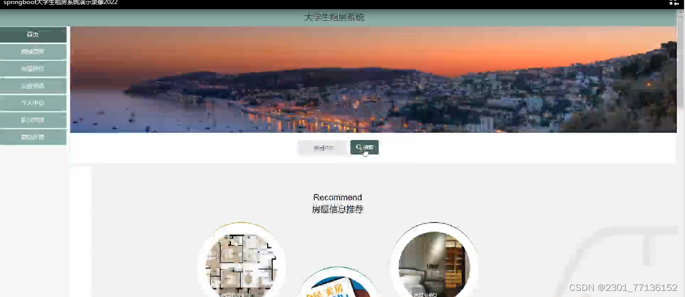大学生租房系统,在系统首页可以查看首页,房屋信息,房屋评价,公告资讯,个人中心,后台管理,意见反馈等内容,并进行详细操作;如图所示。