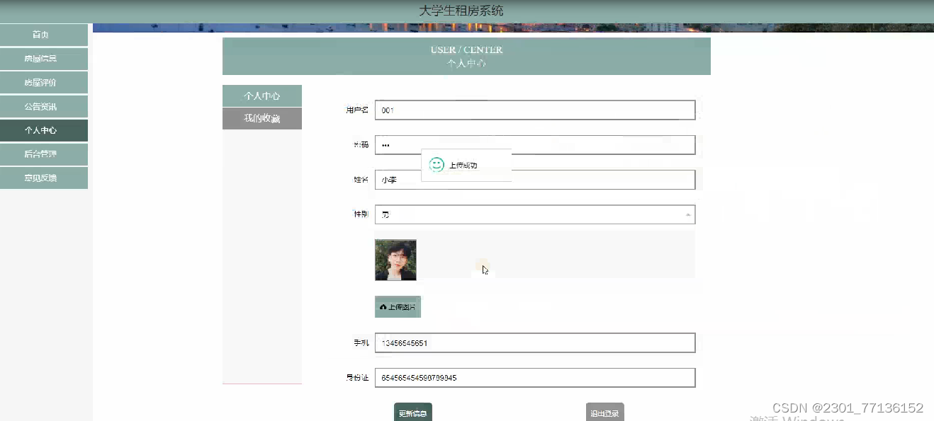 个人中心,在个人中心页面通过填写用户名,密码,姓名,性别,图片,手机,身份证等内容进行更新信息操作,还可以对我的收藏进行详细操作,如图所示。