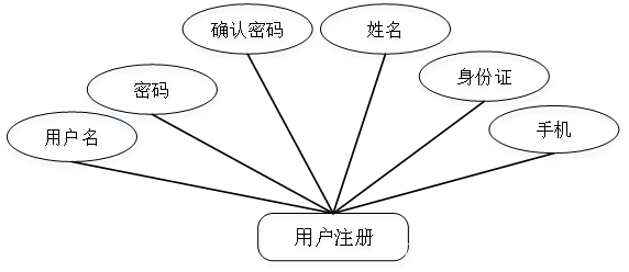 用户注册实体包括用户名,密码,确认密码,姓名,手机,身份证等属性。用户注册实体图如图所示: